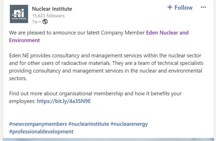 We are delighted to confirm that Eden NE has joined, as a Company Member, The Nuclear Institute, and we are looking forward to the mutual support and benefits for all of our staff that membership offers.