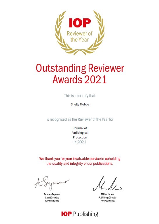 Eden NE are proud to share that Shelly Mobbs has been awarded the "Outstanding Reviewer of the Year (2021) Award for the Journal of Radiological Protection". More information can be found in the web announcement: Journal of Radiological Protection: 2021 Outstanding Reviewer Awards - IOPscience - Publishing Support .